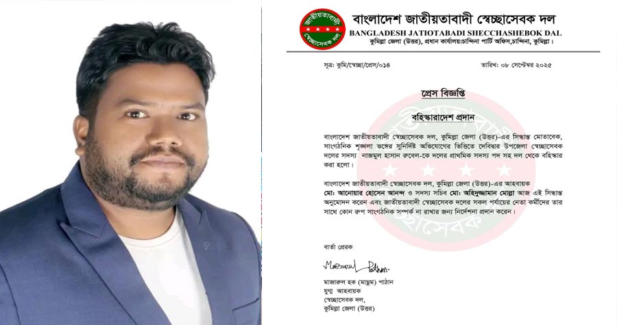 সিদ্ধান্তটি অনুমোদন করেন কুমিল্লা জেলা উত্তর স্বেচ্ছাসেবক দলের আহ্বায়ক মো. আনোয়ার হোসেন আনন্দ ও সদস্য সচিব মো. অহিদুজ্জামান মোল্লা। বিজ্ঞপ্তিতে উল্লেখ করা হয়, “বাংলাদেশ জাতীয়তাবাদী স্বেচ্ছাসেবক দল- কুমিল্লা জেলার (উত্তর) এর সিদ্ধান্তে, সংগঠনের শৃঙ্খলা ভঙ্গের সন্দেহজনক অভিযোগের ভিত্তিতে দেবীদ্বার উপজেলা স্বেচ্ছাসেবক লীগের সদস্য নাজমুল হাসান রুবেলকে তার প্রাথমিক সদস্যপদসহ দল থেকে বহিষ্কার করা হলো।”