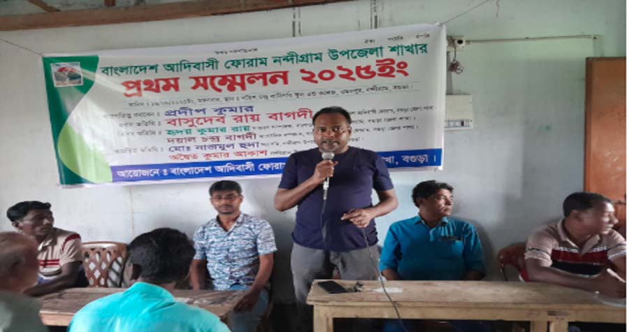 বগুড়ার নন্দীগ্রামে বাংলাদেশ আদিবাসী ফোরাম উপজেলা শাখার প্রথম সম্মেলন সফলভাবে অনুষ্ঠিত হয়েছে। মঙ্গলবার (১৬ সেপ্টেম্বর) বিকেলে নন্দীগ্রাম পৌরসভার ২নং ওয়ার্ডের ওমরপুর সতীশ চন্দ্র কারিগরি স্কুল ও বিএম কলেজের মিলনায়তনে এই সম্মেলন অনুষ্ঠিত হয়। এতে সভাপতিত্ব করেন বাংলাদেশ আদিবাসী ফোরাম নন্দীগ্রাম উপজেলার সভাপতি প্রদীপ কুমার বাগদী।