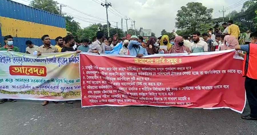 চাকরিতে পুনর্বহালসহ মোট ছয় দফা দাবিতে ঢাকা-চট্টগ্রাম মহাসড়ক অবরোধ করে রেখেছেন ইসলামী ব্যাংকের চাকরিচ্যুত কর্মকর্তা ও কর্মীরা। এর ফলে মহাসড়কে যান চলাচল বন্ধ হয়ে গেছে, সৃষ্টি হয়েছে ব্যাপক যানজট। শনিবার (৪ অক্টোবর) সকাল সাড়ে ১১টার দিকে চট্টগ্রামের ফৌজদার হাট ক্যাডেট কলেজ এলাকায় এই কর্মসূচি শুরু হয়। সংশ্লিষ্ট কর্মকর্তা ও কর্মীরা ঐ স্থানে মানববন্ধন করে, যা আধ ঘণ্টার বেশি সময় ধরে চলতে থাকে। এরপর তারা শান্তিপূর্ণভাবে মহাসড়ক অবরোধ করে অবস্থান নেন। আন্দোলনকারীদের মধ্যে একজন কর্মকর্তা, সাইদুল ইসলাম, বলেন, আমাদের প্রায় ৪০০ কর্মকর্তা অযৌক্তিক ও অমানবিকভাবে চাকরিচ্যুত করা হয়েছে। এর পাশাপাশি আরও পাঁচ হাজারের বেশি কর্মকর্তাকে ওএসডি করে কর্মস্থলে নিষ্ক্রিয় অবস্থায় রাখা হয়েছে। এই পরিস্থিতিতে তাদের ধৈর্য্য হারানোর অবস্থা হয়েছে। তিনি আরও বলেন, আমাদের ছয় দফা দাবি—যেখানে চাকরিচ্যুত কর্মকর্তা পুনর্বহাল, ওএসডি প্রত্যাহার এবং আরও কিছু গুরুত্বপূর্ণ বিষয় রয়েছে—শান্তিপূর্ণ আন্দোলনের মাধ্যমে সরকারের দৃষ্টি আকর্ষণ করতে এই মানববন্ধন করছি। এটির মূল উদ্দেশ্য, দেশের মানুষ ও সরকার যেন আমাদের ন্যায্য দাবিগুলো বোঝে। দাবিগুলোর মধ্যে উল্লেখযোগ্য হলো: ১. চাকরিবিধি লঙ্ঘন করে বিনা কারণেই চাকরিচ্যুত কর্মকর্তাদের স্বপদে পুনর্বহাল করতে হবে। ২. প্রহসনমূলক পরীক্ষা কেন বন্ধ করা হবে না, তা বন্ধ করতে হবে। ৩. বৈষম্যপূর্ণ ও রাজনীতিমুক্ত পরিবেশ সৃষ্টি করতে হবে। ৪. শর্ত আরোপ করে সব ধরনের অ্যাসেসমেন্ট টেস্ট বন্ধ করতে হবে। ৫. চট্টগ্রামের কর্মকর্তাদের ওপর চালানো মানসিক ও শারীরিক নির্যাতনের সুষ্ঠু অনুসন্ধান করে, দোষীদের শাস্তি দিতে হবে এবং পুনরায় কর্মস্থলে ফিরিয়ে আনতে হবে। ৬. পরীক্ষা বর্জনের জন্য যে মামলার বিরুদ্ধে মামলা ও অভিযোগ করা হয়েছে, তা অবিলম্বে প্রত্যাহার করতে হবে। ওই কর্মকর্তাদের দাবি ও আন্দোলনে এখন নিরবচ্ছিন্ন সমর্থন প্রত্যাশা করছে সংগঠনের অন্যান্য সদস্যরাও।