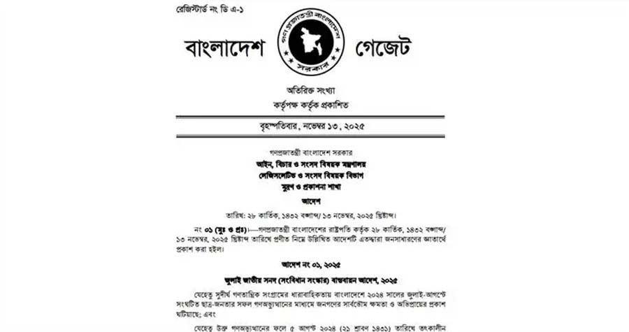 জুলাই জাতীয় সংবিধান সংস্কার বাস্তবায়ন আদেশ, ২০২৫ অনুমোদন দিয়েছে উপদেষ্টা পরিষদ। প্রয়োজনীয় স্বাক্ষর শেষে লçokনটি দ্রুত গেজেট আকারে প্রকাশ করা হবে। বৃহস্পতিবার (১৩ নভেম্বর) দুপুরে জাতির উদ্দেশে দেওয়া ভাষণে প্রধান উপদেষ্টা ড. মুহাম্মদ ইউনূস এ ঘোষণা দেন।