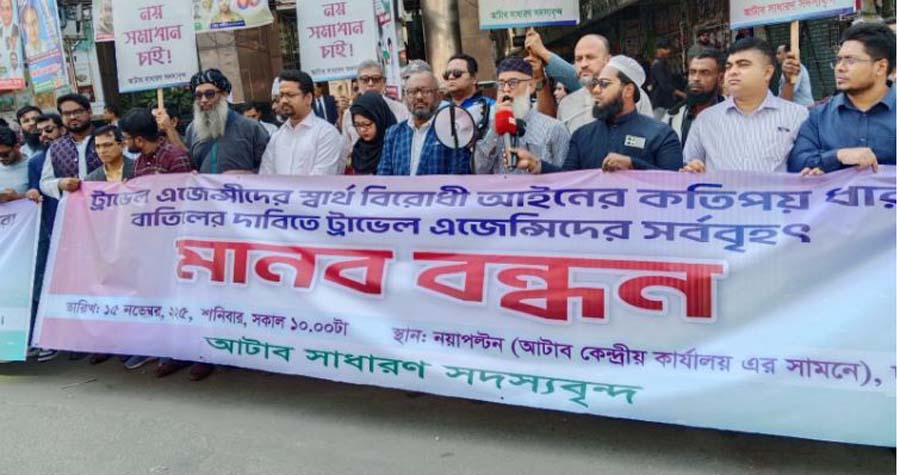 শনিবার (১৫ নভেম্বর) সকাল সাড়ে ১০টায় রাজধানীর হোটেল ভিক্টরি রোডের সামনে আটাবের সদস্যরা মানববন্ধন করেন। সেখানে তারা নাড়ির স্বার্থের বিষয়টি তুলে ধরে বিভিন্ন স্লোগান দেন, যেমন- “যে আইন জীবনযোড়ায় বাঁধা সৃষ্টি করে, তা জনগণের জন্য নয়”, “বিটুবি বন্ধ নয়, সমাধান চাই” এবং “আমরা ভ্যাট দিই, ট্যাক্স দিই, তবুও কেন আমাদের ব্যবসা বন্ধের আইন”। তারা আরও দাবি করেন, সকল ট্রাভেল এজেন্সীর জন্য উড়োজাহাজ টিকিট উন্মুক্ত করতে হবে এবং অবিলম্বে এই খসড়ার চাপিয়ে দেওয়া কিছু বিধান বাতিল করতে হবে।