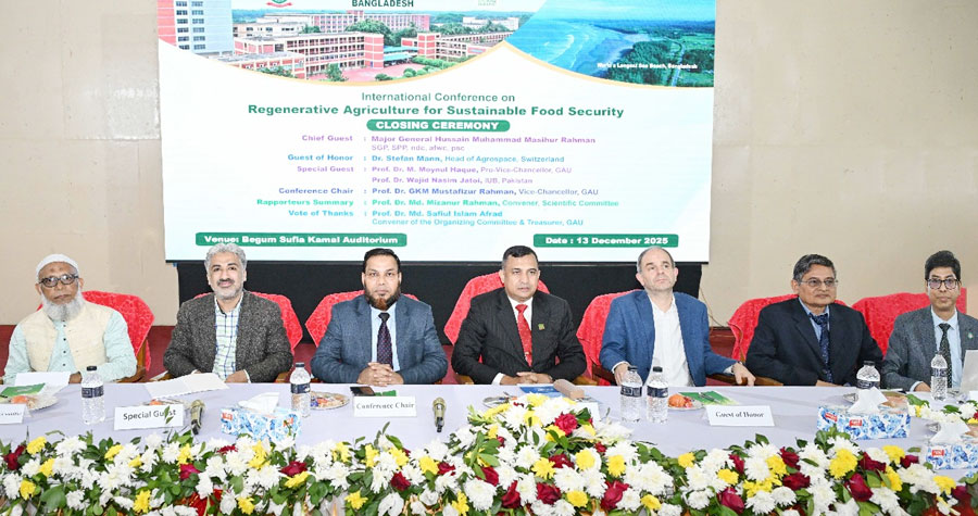 গাজীপুর কৃষি বিশ্ববিদ্যালয় (গাকৃবি) একটি দুই দিনব্যাপী আন্তর্জাতিক সম্মেলন সফলভাবে সম্পন্ন হয়েছে, যেখানে জলবায়ু পরিবর্তন, মাটির ক্ষয়ক্ষতি এবং বৈশ্বিক খাদ্য সংকট মোকাবেলার জন্য রিজেনারেটিভ কৃষিকে ভবিষ্যতের খাদ্য নিরাপত্তার অন্যতম মূল সমাধান হিসেবে তুলে ধরা হয়েছে। অনুষ্ঠানের সমাপনী দিন শনিবার (১৩ ডিসেম্বর) বেগম সুফিয়া কামাল অডিটোরিয়ামে ‘Regenerative Agriculture for Food Security’ শীর্ষক এই বৈশ্বিক এক আয়োজনের শেষ পর্ব অনুষ্ঠিত হয়। মূল আলোচনাগুলোর মধ্যে ছিল বিজ্ঞান ভিত্তিক নতুন চিন্তা ও প্রয়োগের মাধ্যমে কৃষিকে টেকসই ও জীবন্ত রাখা। এতে দেশের পাশাপাশি বিদেশের খ্যাতনামা গবেষক, নীতিনির্ধারণকারী, শিক্ষাবিদ এবং কৃষি বিশেষজ্ঞ অংশগ্রহণ করেন, যারা আলোচনায় সক্রিয়ভাবে অংশগ্রহণ ও অভিজ্ঞতা বিনিময় করেন। অনুষ্ঠানে সভাপতিত্ব করেন গাজীপুর কৃষি বিশ্ববিদ্যালয়ের ভাইস-চ্যান্সেলর প্রফেসর ড. জিকেএম মোস্তাফিজুর রহমান। প্রধান অতিথি ছিলেন বাংলাদেশ সেনাবাহিনীর উচ্চপদস্থ কর্মকর্তা মুহাম্মদ মাসীহুর রহমান, এসজিপি, এসপিপিএম, এনডিসি, এএফডব্লিউসি, পিএসসি। এ ছাড়াও, আন্তর্জাতিক কৃষি প্রযুক্তি সংস্থা অ্যাগ্রোস্পেস-এর প্রধান ড. স্টিফেন মান গেস্ট অব অনার হিসেবে বক্তব্য রাখেন। বিশেষ অতিথিরা ছিলেন ড. স্টিফেন ময়নুল হক এবং পাকিস্তানের ইসলামিয়া ইউনিভার্সিটি অব বাহাওয়ালপুর-এর অধ্যাপক ড. ওয়াজিদ। সম্মেলনে গাকৃবি’র বিভিন্ন অনুষদের ডিন, পরিচালক, রেজিস্ট্রার, প্রক্টর এবং দেশের এবং বিদেশের বিভিন্ন গবেষক অংশগ্রহণ করেন। মোট ১০টি থিমে গবেষণাপত্র উপস্থাপিত হয়, যেখানে রিজেনারেটিভ কৃষি প্রযুক্তি, মাটির স্বাস্থ্য উন্নয়ন, খাদ্য নিরাপত্তা, জলবায়ু-সহনশীল কৃষি ব্যবস্থা ও উদ্ভাবনী প্রযুক্তির আধুনিক ব্যবহার নিয়ে আলোচনা হয়। সমাপনী অধিবেশনে গবেষণাগুলোর সারসংক্ষেপ উপস্থাপন করেন ড. মিজানুর রহমান। এর পরে, অতিথিরা ও গবেষকরা তাদের প্রকাশিত গবেষণার জন্য ওরাল, পোস্টার ও ফ্ল্যাশ ক্যাটাগরিতে অসাধারণ পারফরম্যান্সে পুরস্কার লাভ করেন। প্রধান অতিথির বক্তব্যে মুহাম্মদ মাসীহুর রহমান বলেন, জলবায়ু পরিবর্তনের চ্যালেঞ্জ মোকাবেলায় রিজেনারেটিভ কৃষি ভবিষ্যৎ খাদ্য নিরাপত্তার জন্য এক গুরুত্বপূর্ণ প্রযুক্তি। তার মতে, এসব গবেষণার বাস্তবায়ন কৃষি খাতকে আরও টেকসই করবে। উপাচার্য প্রফেসর ড. জিকেএম মোস্তাফিজুর রহমান বললেন, জলবায়ু পরিবর্তন ও মাটির অবক্ষয় মোকাবিলায় রিজেনারেটিভ কৃষি গুরুত্বপূর্ণ এবং এই সম্মেলন এক অত্যন্ত প্রাসঙ্গিক ও সময়োপযোগী উদ্যোগ। তিনি আশাবাদ ব্যক্ত করে বলেন, এ থেকে পাওয়া গবেষণাগুলো দেশের খাদ্য নিরাপত্তা নিশ্চিত করতে গুরুত্বপূর্ণ ভূমিকা রাখতে পারে। সমাপ্তি অনুষ