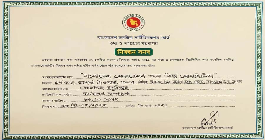 গণপ্রজাতন্ত্রী বাংলাদেশ সরকারের পক্ষ থেকে বাংলাদেশ ফেডারেশন অফ ফিল্ম সোসাইটিজকে অফিসিয়াল নিবন্ধন দেওয়া হয়েছে। এই নিবন্ধন আগামী পাঁচ বছরের জন্য বৈধ থাকবে।